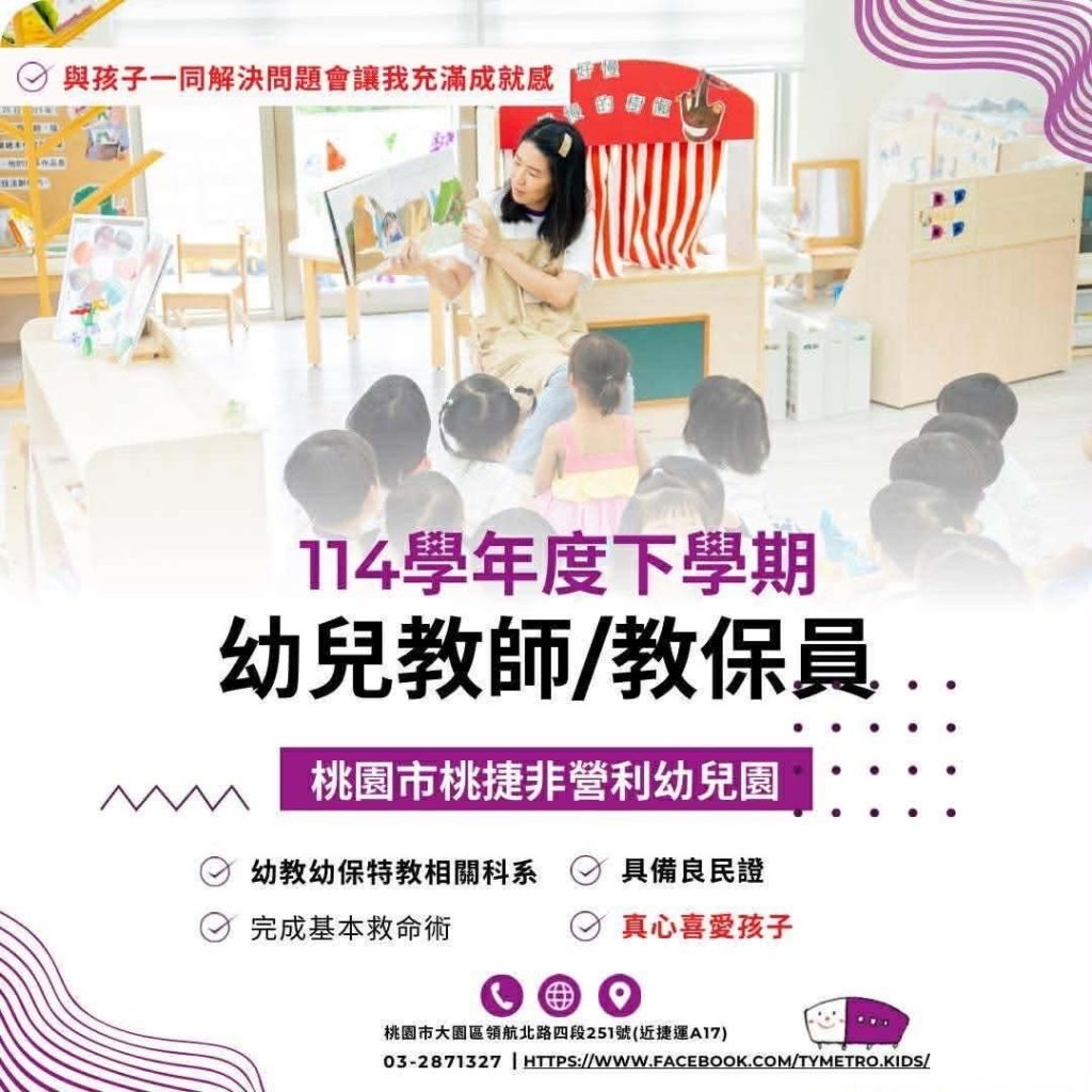 桃園市桃捷非營利幼兒園 114年度下學期幼兒教師/教保員職缺公告