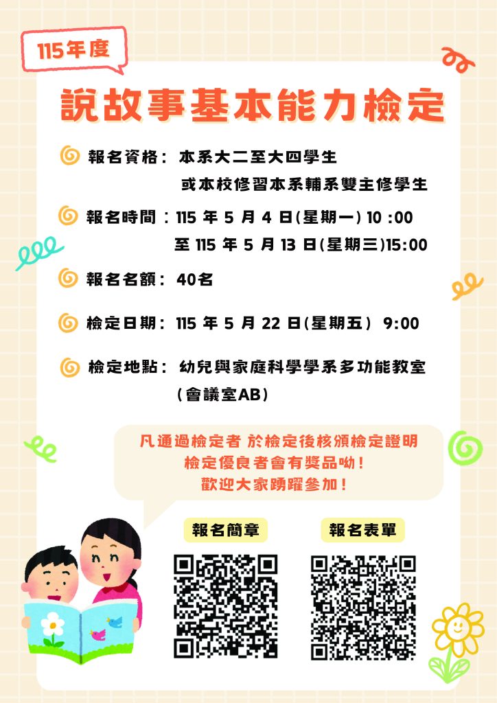 國立臺灣師範大學幼兒與家庭科學學系115年度「說故事基本能力檢定」報名簡章公告,請踴躍報名參加