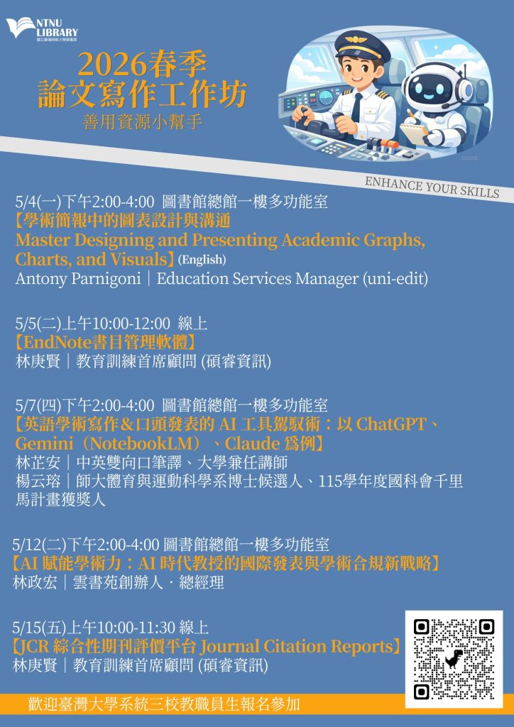 【圖書館】2026春季論文寫作工作坊 歡迎臺灣大學系統三校教職員生報名
